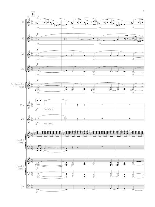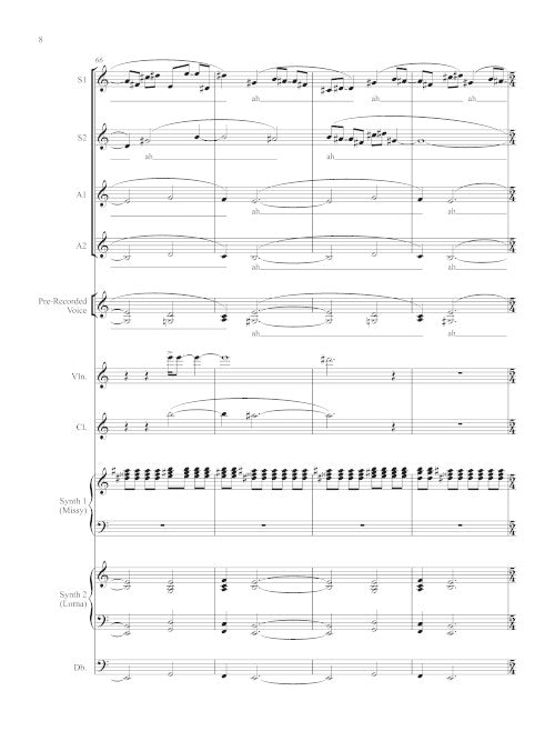 for SSAA chorus, pre-recorded electronics, and ensemble (2012, ca. 6 minutes). Packages of 10 choral scores plus 1 full score and set of parts for 1 clarinet, 1 violin, 2 keyboards, 1 double bass, and link to downloadable electronics.