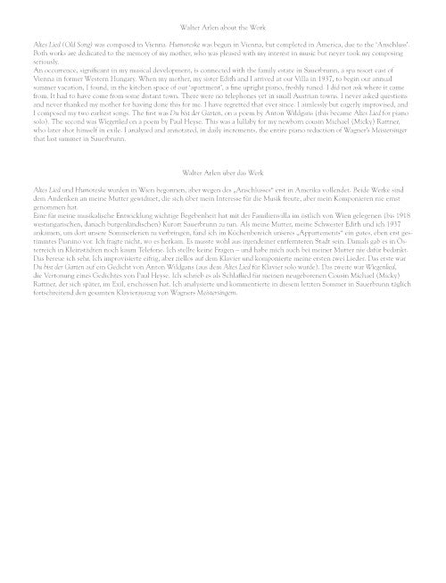 Altes Lied (Old Song) was composed in Vienna. Humoreske was begun in Vienna, but completed in America, due to the ‘Anschluss’. Both works are dedicated to the memory of my mother, who was pleased with my interest in music but never took my composing seriously.
