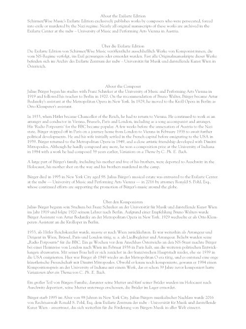 G. Schirmer/Wise Music’s Exilarte Edition exclusively publishes works by composers who were persecuted, forced into exile, or murdered by the Nazi regime. All original manuscripts of these works are archived in the Exilarte Center at the mdw – University of Music and Performing Arts Vienna in Austria.