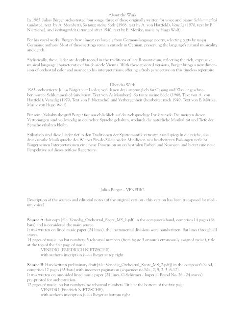 In 1985, Julius Bürger orchestrated four songs, three of these originally written for voice and piano: Schlummerlied (undated, text by A. Mombert), So tanze meine Seele (1968, text by A. von Halzfeld), Venedig (1970, text by F. Nietzsche), and Verborgenheit (arranged after 1940, text by E. Mörike, music by Hugo Wolf).