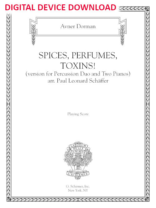The title Spices, Perfumes, Toxins! refers to three substances that are extremely appealing, yet filled with danger. Spices delight the palate, but can cause illness; perfumes seduce, but can also betray; toxins bring ecstasy, but are deadly. The concerto combines Middle-Eastern drums, orchestral percussion, and rock drums with orchestral forces – a unique sound both enticing and dangerous.